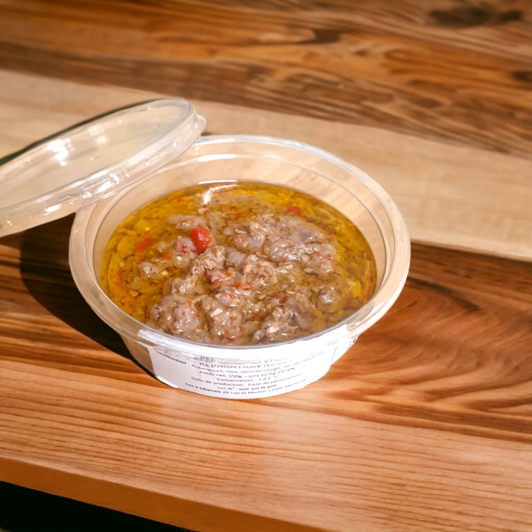 Aubergines, noix, poivron rouge, ail, huile végétale, sel.